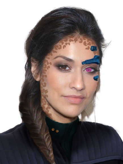 | Physical Description | She is of average height and build, filling out her uniform nicely, with shapely legs and bust. Dark trill spots running down her face and disappearing under her uniform. Her beauty was usually secondary to the borg implants on her face, and the violet left eye. |
